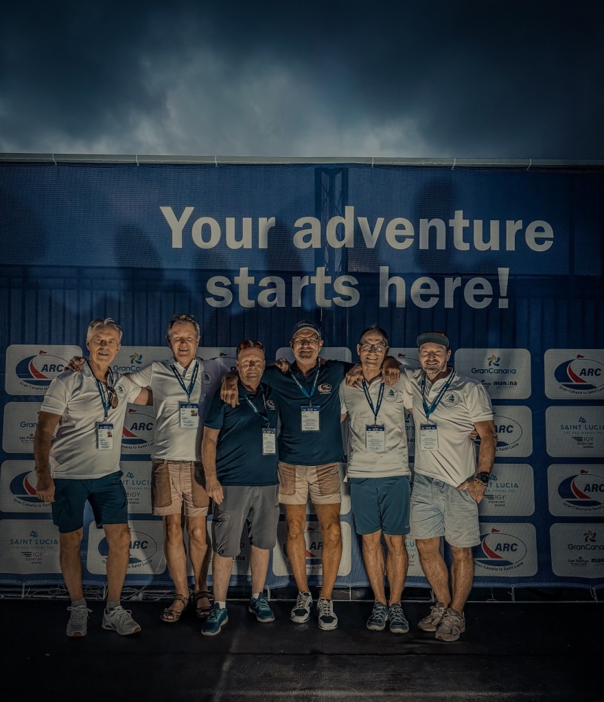 Siste samling før avreise – alle båtene, alle mannskapene, alle forventningene på ett sted. Vi står samlet foran startbanneret, endelig hele gjengen på plass. Dette er øyeblikket der alt forarbeid møter virkelighet, der planlegging blir til avreise, og der spenningen virkelig setter seg i kroppen. Neste gang vi tar et bilde sammen, er vi på den andre siden av Atlanteren.