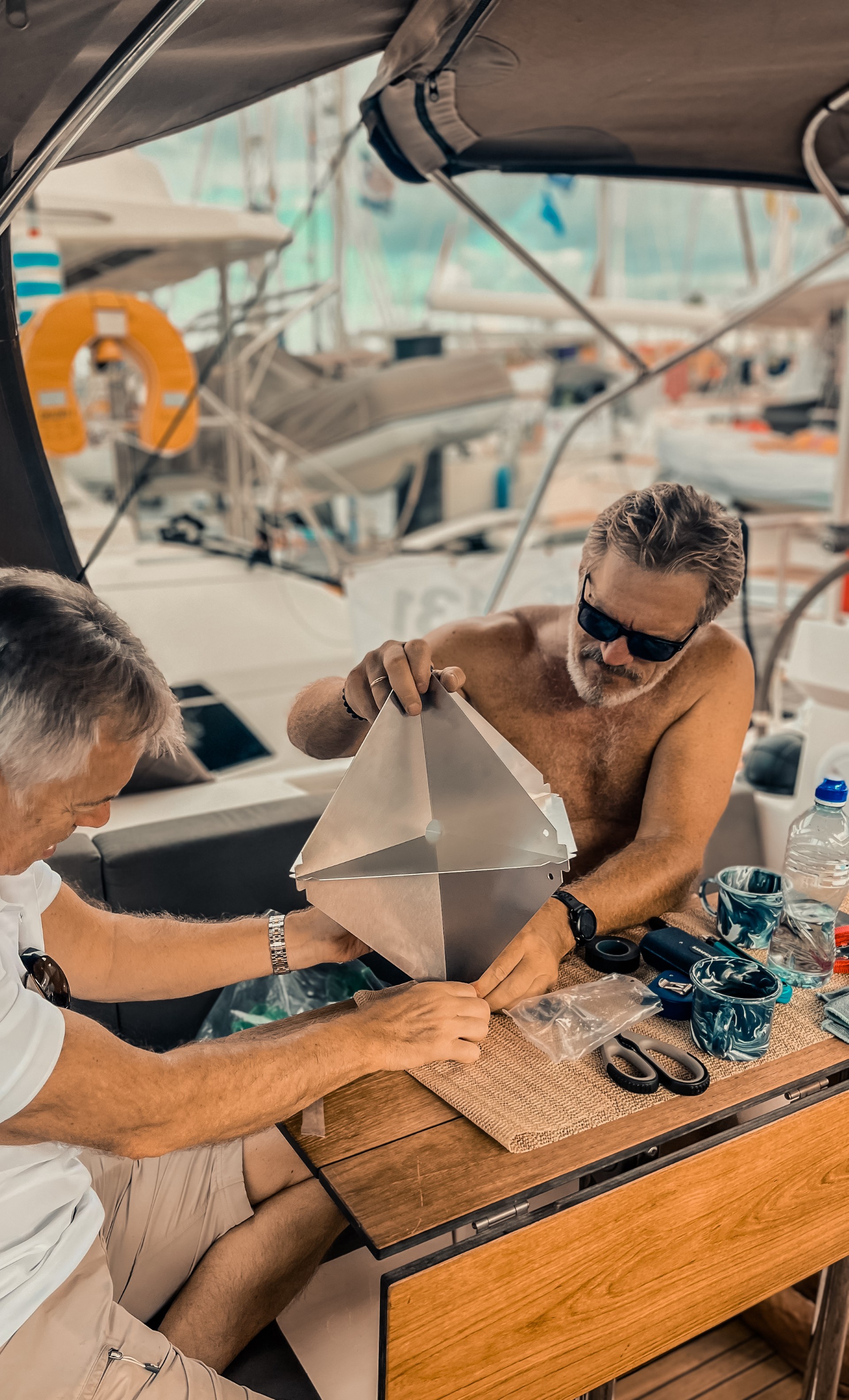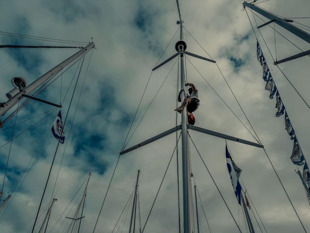 Rune og Jørn skulle egentlig bare henge opp radarreflektoren… men underveis tok det en uventet sving mot juleverksted. Plutselig satt de der og brettet ‘julestjerne’ midt i Las Palmas, mens vi andre lurte på om juletreet også var på vei om bord. ARC-forberedelser med et snev av førjulsstemning
