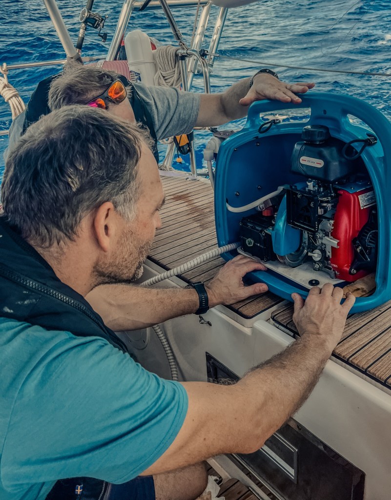 Watermakeren fikk seg en skikkelig “vi-må-snakkes”-runde i dag. Med bare 41% igjen på tanken begynner vi å bli ganske avhengige av å få liv i denne blå boksen, ellers blir det fort mindre kaffe, mindre dusj og mer bønn om regn. Så nå skrus det, sjekkes, blåses og prøves — alt for å få saltvann omgjort til noe vi faktisk kan drikke igjen.